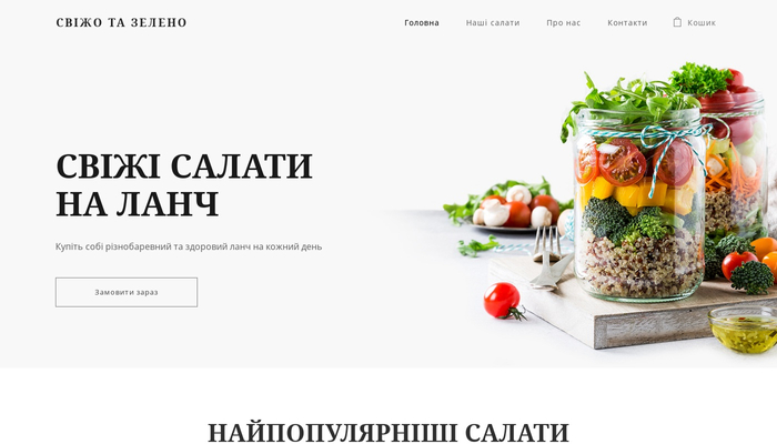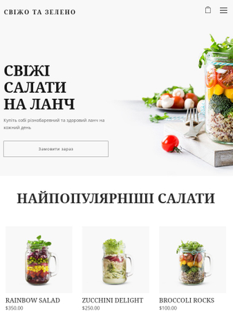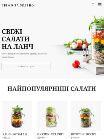 Розпочніть свій бізнес з доставкою продуктів харчування за допомогою цього шаблону! Легко продавайте смачні салати та здорову їжу. Просто додайте кілька привабливих зображень, опишіть, що робить вашу продукцію особливою, а орди голодних покупців встануть в чергу, перш ніж можна буде сказати "салат".