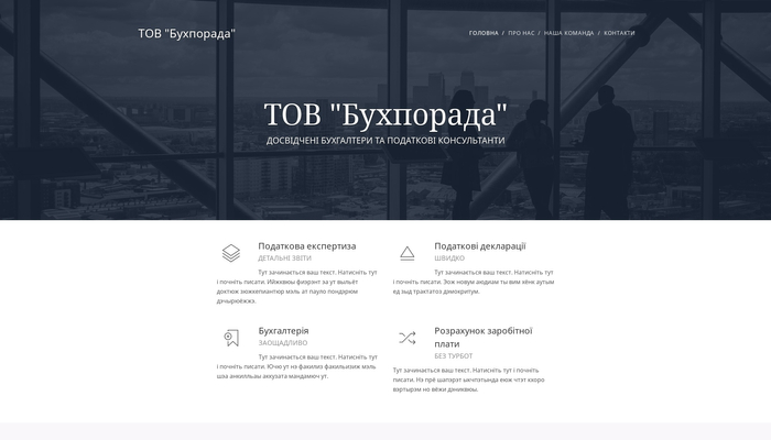 Шаблон підійде податковим консультантам, нотаріусам та офіціальним службовцям. Він допоможе вам показати всі ваши послуги, а також ви можете викорустовувати різні іконки.